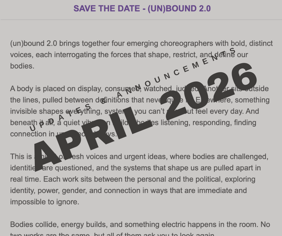 (un)bound 2.0 brings together four emerging choreographers with bold, distinct voices, each interrogating the forces that shape, restrict, and define our bodies.