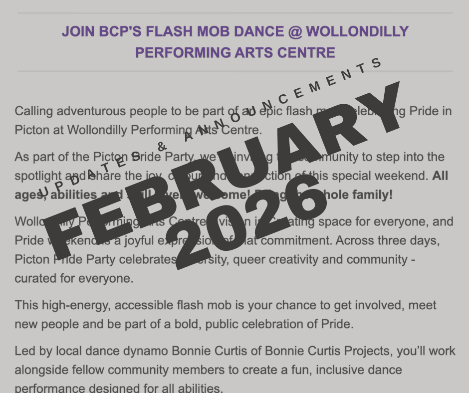 Calling adventurous people to be part of an epic flash mob celebrating Pride in Picton at Wollondilly Performing Arts Centre.