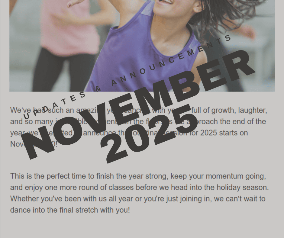 This is the perfect time to finish the year strong, keep your momentum going, and enjoy one more round of classes before we head into the holiday season. Whether you’ve been with us all year or you’re just joining in, we can’t wait to dance into the final stretch with you!